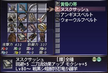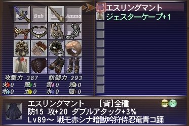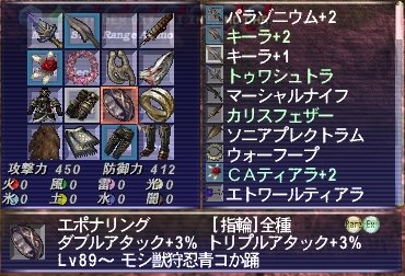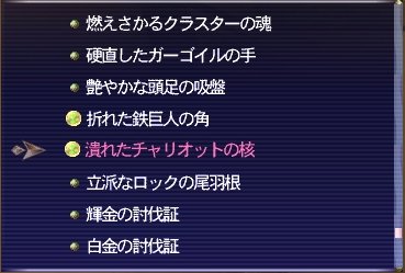 サイレガ、サンダガIII~IV、エアロガIII~IV、サンダーIV~V、エアロIV~V HPが減ると範囲化:バースト、トルネド、スタン サンダー系単体魔法は自己に使用してHPを回復してくる HP回復量:サンダーIV(約600前後)、サンダーV(約1000前後) 特徴 かなりのファストキャスト持ち。 サンダー系単体魔法でHPを回復した後は、 2~3分ぐらい?ショックスパイクが付与される。 敵のHPが減るほどショックスパイクの威力がアップ。 リービンウィンドで風を纏うと、近づくだけで吹き飛ばされる。 ただし、移動速度ダウン装備を装備していれば、吹き飛ばし無効。 通常攻撃の追加効果にスタン。 メインはシ/忍、姫は白/暗。 姫がサポ暗なのは、白がまだ83で、サポ黒じゃスタンが使えないから!(;´∀`) アートマはメインが灰燼・凶角・明星、姫が妖艶・邪鬼・野望で挑みました。 敵の命中はかなり低め。 サブでオーリックを使った以外は、ガチガチの回避装備でやってましたが、 おそらく、ある程度ヘイスト装備に変えても十分に避けるんじゃないかな? 以下、わたしが注意していた点を箇条書き。 ・なんといってもシェルV メリポ5振りのシェルラVあり、明星ありでもサンダガIVで800食らう上に、 魔法の詠唱頻度も高めなので、これをかけ忘れると、 ケアルだけでMPが一瞬でなくなります! 希望の青弱点の時間ぎりぎりに見つけたりした場合、意外に忘れがちに・・・。 ・単体サンダー系魔法にスタン 2垢だとどうしても反応が遅れたり、他の魔法唱えてたり、 あるいはリキャ前にまた撃たれてしまったりで、 確実には止められませんが、ある程度止めるだけでも非常に楽になります。 また、当然ながらショックスパイクになってしまったら、 消えるまで後ろを向いて待ちます。 ・蝉 魔法が9割がたガ系&TP技にも蝉消去技が多いので、 蝉は非常に早いサイクルで剥がされるものの、 それでも常に蝉は維持するようにしていました。 というのも、フェラルペックが瀕死&ヘイトリセットで、 HPが赤くなったままタゲを取り返さなくてはならないので、 そこで蝉がなかった場合、いきなり被弾すると死にかねないからです。 フェラルペックを食らっても蝉自体は残るので、 タゲを取り返したら急いでケアルすれば大丈夫です。 ・フェラルペックへの対応 WSを即撃ちせずに、敵のTP技の後にWSを撃つようするだけ! これ、ほんとに重要です! 初挑戦の時、フェラルペックが一度しか来なかったし、 その時は運よくTPが溜まってたので問題なかったんですが、 それで調子に乗って、2戦目でWS即撃ちしてたら・・・。 自己サンダーでショックスパイク&フェラルペックのコンボで詰み。 せっかく青弱点つけたのに、負けるという事態になりました。(´Д⊂ ・リービンウィンド Wikiには載ってないんですが、どうもこれにもヘイトリセットがある模様。 うまく地形にはまりこんで、吹き飛ばされながら殴れる場所でやってれば、 すぐにタゲ取り返せるし、そのまま戦えるのでいいんですが・・・。 わたしはその場所しらなかったし、ダスクなんかも持っていってなかったので、 これが来ると相当苦労しました。(;´Д`) 幸いにも使用頻度はかなり低めで、1戦で1回使うか使わないか、程度ですが。 これが来たら、風消えるまでマラソンです。 とりあえずこの辺気を付けてれば、2垢、および少人数でも勝てるかと。 また、運悪くサンダガIVやフェラルペック連打されると、 白のMPがだいぶ削られるので、一応ルシドエーテルなんかはあると安心かも。 初戦はシェルかけ忘れでエーテル使う羽目になりましたw 2戦以降は、十分MPもってましたけどね。 白83だったしサポ暗だし、AF3脚なんかもなくても大丈夫だったので、 ちゃんとした白なら問題ないと思います。(*'-') 初戦のドロップはこんな感じ。青弱点もなかったししょうがないですが。 その後も、暇を見ては突時間に合わせてコンシュに入り浸って・・・。 青弱点つけずに倒した4戦目で まさかのドロップ!ヽ(´ー`)ノ トレハンあるし、青つかなくても出るときは出ますね! その他、最近取れた装備もついでにペタリ。 まだ倒してない人がいたので、エンピ素材ついでに倒したヤーネイで アイアスボンネットをロット勝ち出来たのが嬉しい!ヽ(´ー`)ノ ロキカフタンと合わせてWS装備もだいぶ様変わりしたなぁ・・・。 装備以外にも、コンシュ通いのついでに有色つくって幽遠とったり、 LSメンが持ってたトリガーで隠密とったり、 2垢で漂遊や竜息とって遊んでみたりと、なかなかに楽しかったです! 明けましておめでとうございます。