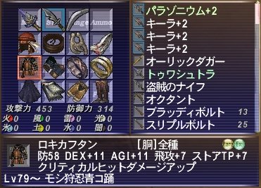 防58 DEX+11 AGI+11 飛攻+7 ストアTP+7 クリティカルヒットダメージアップ モシ狩忍青コ踊 Lv79 RaEx WS用装備や、ヘイスト余剰分の選択肢の一つとして 前々から欲しかったロキカフタン。 イツパパの鱗粉が集まればルドラストームでも使えるし、 本格的に欲しくなってきたので、Turulに2垢で挑戦してみました!('∇') Turul 以前は一度倒すと、リポップまで早くても30分、最長120分ぐらいだったようですが、 今ではVUの影響で10~15分?でリポップ。 普段は空中に浮いていて、その間は広域サーチにかからず。 その上に、巡回範囲が非常に広いので、まず探すのが一苦労。(´д`) (カヒライス・アーリマン・トレント・ブガ・キノコ・ウィヴルエリアあたり?) ロキカフタンが素晴らしい性能だけに、ライバルがいることも多く、 突時間丸々捜索に使ったのに、見つからずに終わることも多々ありました。(´Д⊂ 使用技