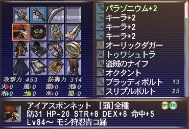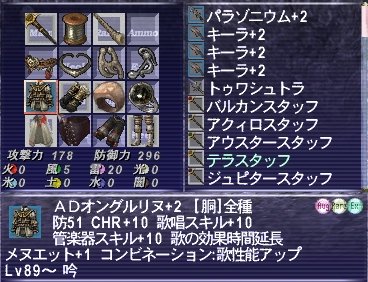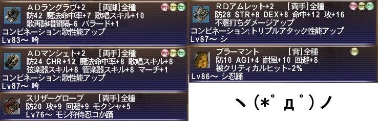 サイレガ、サンダガIII~IV、エアロガIII~IV、サンダーIV~V、エアロIV~V HPが減ると範囲化:バースト、トルネド、スタン サンダー系単体魔法は自己に使用してHPを回復してくる HP回復量:サンダーIV(約600前後)、サンダーV(約1000前後) 特徴 かなりのファストキャスト持ち。 サンダー系単体魔法でHPを回復した後は、 2~3分ぐらい?ショックスパイクが付与される。 敵のHPが減るほどショックスパイクの威力がアップ。 リービンウィンドで風を纏うと、近づくだけで吹き飛ばされる。 ただし、移動速度ダウン装備を装備していれば、吹き飛ばし無効。 通常攻撃の追加効果にスタン。 メインはシ/忍、姫は白/暗。 姫がサポ暗なのは、白がまだ83で、サポ黒じゃスタンが使えないから!(;´∀`) アートマはメインが灰燼・凶角・明星、姫が妖艶・邪鬼・野望で挑みました。 敵の命中はかなり低め。 サブでオーリックを使った以外は、ガチガチの回避装備でやってましたが、 おそらく、ある程度ヘイスト装備に変えても十分に避けるんじゃないかな? 以下、わたしが注意していた点を箇条書き。 ・なんといってもシェルV メリポ5振りのシェルラVあり、明星ありでもサンダガIVで800食らう上に、 魔法の詠唱頻度も高めなので、これをかけ忘れると、 ケアルだけでMPが一瞬でなくなります! 希望の青弱点の時間ぎりぎりに見つけたりした場合、意外に忘れがちに・・・。 ・単体サンダー系魔法にスタン 2垢だとどうしても反応が遅れたり、他の魔法唱えてたり、 あるいはリキャ前にまた撃たれてしまったりで、 確実には止められませんが、ある程度止めるだけでも非常に楽になります。 また、当然ながらショックスパイクになってしまったら、 消えるまで後ろを向いて待ちます。 ・蝉 魔法が9割がたガ系&TP技にも蝉消去技が多いので、 蝉は非常に早いサイクルで剥がされるものの、 それでも常に蝉は維持するようにしていました。 というのも、フェラルペックが瀕死&ヘイトリセットで、 HPが赤くなったままタゲを取り返さなくてはならないので、 そこで蝉がなかった場合、いきなり被弾すると死にかねないからです。 フェラルペックを食らっても蝉自体は残るので、 タゲを取り返したら急いでケアルすれば大丈夫です。 ・フェラルペックへの対応 WSを即撃ちせずに、敵のTP技の後にWSを撃つようするだけ! これ、ほんとに重要です! 初挑戦の時、フェラルペックが一度しか来なかったし、 その時は運よくTPが溜まってたので問題なかったんですが、 それで調子に乗って、2戦目でWS即撃ちしてたら・・・。 自己サンダーでショックスパイク&フェラルペックのコンボで詰み。 せっかく青弱点つけたのに、負けるという事態になりました。(´Д⊂ ・リービンウィンド Wikiには載ってないんですが、どうもこれにもヘイトリセットがある模様。 うまく地形にはまりこんで、吹き飛ばされながら殴れる場所でやってれば、 すぐにタゲ取り返せるし、そのまま戦えるのでいいんですが・・・。 わたしはその場所しらなかったし、ダスクなんかも持っていってなかったので、 これが来ると相当苦労しました。(;´Д`) 幸いにも使用頻度はかなり低めで、1戦で1回使うか使わないか、程度ですが。 これが来たら、風消えるまでマラソンです。 とりあえずこの辺気を付けてれば、2垢、および少人数でも勝てるかと。 また、運悪くサンダガIVやフェラルペック連打されると、 白のMPがだいぶ削られるので、一応ルシドエーテルなんかはあると安心かも。 初戦はシェルかけ忘れでエーテル使う羽目になりましたw 2戦以降は、十分MPもってましたけどね。 白83だったしサポ暗だし、AF3脚なんかもなくても大丈夫だったので、 ちゃんとした白なら問題ないと思います。(*'-') 初戦のドロップはこんな感じ。青弱点もなかったししょうがないですが。 その後も、暇を見ては突時間に合わせてコンシュに入り浸って・・・。 青弱点つけずに倒した4戦目で まさかのドロップ!ヽ(´ー`)ノ トレハンあるし、青つかなくても出るときは出ますね! その他、最近取れた装備もついでにペタリ。 まだ倒してない人がいたので、エンピ素材ついでに倒したヤーネイで アイアスボンネットをロット勝ち出来たのが嬉しい!ヽ(´ー`)ノ ロキカフタンと合わせてWS装備もだいぶ様変わりしたなぁ・・・。 装備以外にも、コンシュ通いのついでに有色つくって幽遠とったり、 LSメンが持ってたトリガーで隠密とったり、 2垢で漂遊や竜息とって遊んでみたりと、なかなかに楽しかったです! 明けましておめでとうございます。