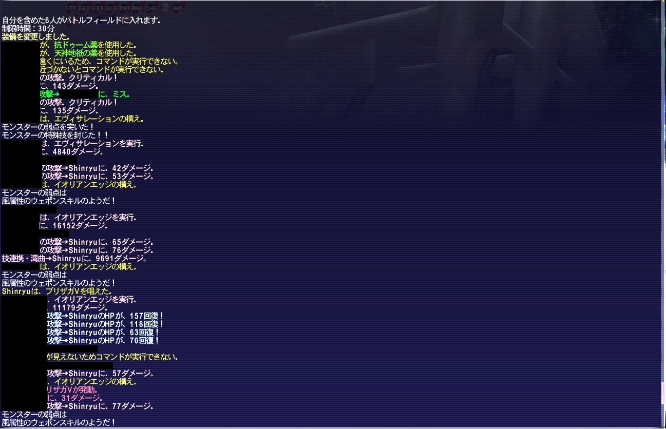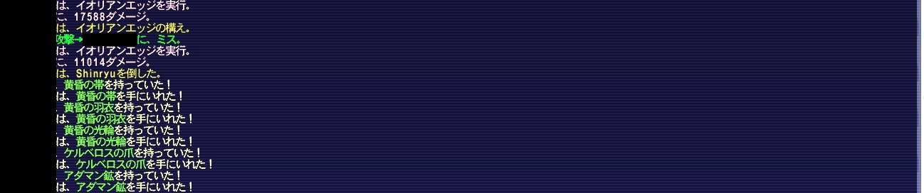 というわけで、神竜シソロやってきましたよ!('∇') いくらネタになるとはいえ、負けるのはさすがに嫌なので、まずは下準備から! といっても、やったのはアートマを一つ取っただけ。 Alkonost コンシュのヒポNMです。思ってたよりデカくてSSがひどいことに。(;´∀`) 天神中は、属性WSが安定して高いダメを出せるようになるため、 さらにそれを伸ばすために、駈風のアートマをゲット! 2垢ではつけない弱点だったので、途中でLSメンを呼んで弱点をついてもらいました。 まさかこんなアートマを取りに行く日が来るとは・・・。 いや、使わないアートマを集めるの、好きですけどねw ってことで下準備が終了。 突入するのは、当然ながら突時間! サポ狩でスラッグも撃てるようにしておきました。 弓はスキルが174で@1足りず、サイドワインダーが撃てないのであきらめw しかし、天神地祇って飛命も上がるんですかね~? 今回、試す機会がなかったのでわからないんですが。 飛命上がらないのなら、サイドワインダーとスラッグショットは当たらなさそうw アビセア-天象の鎖で天神地祇を初交換!すんごいドキドキしました!w アートマは、灰燼・駈風・極彩をチョイス。 イオリアンだけで戦うつもりだったので、灰燼はなくてもよかったんですが、 一応エヴィがどれだけダメ出るかの確認もしたかったので・・・。 エヴィメインで行くなら、灰燼凶角双鎌とかがいいのかな? イオリアンに特化するなら、会心もつけるといいと思います。 わたしは、まだ会心取っていないので、それ以前の問題ですがw 後は、メイン武器をマーシャルナイフに変更し、 トレハン装備をすべてつけて準備完了! ちなみに、マーシャルナイフに変える理由は、 属性WSには武器の性能が関係ないことと、 TPの増加による倍率の変化が大きいからです。('∇')b ってことで、さくっと突入! ・・・緊張しすぎて戦闘中のSSまったく取ってませんでした。(´д`) なので、とりあえずログだけ張ってごまかしておきます・・・。 ログはカット一切なし、これだけで終わりましたw イオリアンが強すぎた! 開幕エヴィで青弱点とか運も良すぎる・・・。 結局神竜はアムネでTP技1回も使うことなく没。なんというフルボッコw ドロップも、トワイライトシリーズこそなかったものの、黄昏系はすべてドロップ。 帯はどうしても早く欲しかったので、本当に嬉しいです!ヽ(´ー`)ノ 青弱点を突くと、黄昏系はドロップ率100%になるとか聞きましたが、 ほんとなんでしょうか。 確かに初クリアの時も、青ついて3種すべて落としてましたけど・・・。 とりあえずこれで私的には神竜は一段落。 後はLSメンつれてRani倒してからですね。 Raniも薬1個で削りきれるといいな~。 そうそう、天神中は通常のWSではあまりダメが伸びないので、 薬役を頼まれた場合は、クリ修正のWSか、属性WSで攻めるのを忘れずに! PR 今日は祝日だし、シャウトがあるかも!と思って仕事前に白門警備していると・・・ タイミングよく、天神使用者1名が総取り、他はクリア希望のシャウトが! すばやくテルして、なんとか参加することができました。 アイテムとクリアが目的なので、青弱点のみ~という感じだったんですが、 青弱点狙い中に引き寄せで後衛がダメ食らったり、TP待ちもあったりで、 ちょっと立て直しの時間があったので、サイクロンを撃ってみたら・・・。 弱点は風属性のWSのようだ!でサイクロンが外れ。 ってことで、陣風が弱点確定。そして、今回天神を使ってくれる人のジョブが、なんと侍! 天神中は普通に陣風を使うので、青弱点つけた後の削りで赤弱点が出て、 さらにそのままテラー中に撃破でアートマも貰えてしまいました!('∇') さらに、アイテムも侍さんが一部以外持ってるということで、 黄昏装備3つがすべてフリロに!・・・帯欲しかったけどロット負けしましたw まぁクリアできただけでもありがたい!なんといっても 天地のジェイドがもらえるのですよ! これで天神地祇が200万>20万に!((((;゚Д゚)))) 一度天神地祇使ってみたかったし、今度、 突時間にソロで神竜やってみようかと思ってますw 黄昏装備はドロップいいみたいだし、トレハンはつけられますしね! できればトワイライトナイフも欲しいけど、こっちは青弱点突かないと絶望的。 サポ狩でいけば、5/13で弱点つけるので、期待はできますが・・・。ドキドキ。 カトゥラエで唯一残っていたRajaをさくっとやってきました!