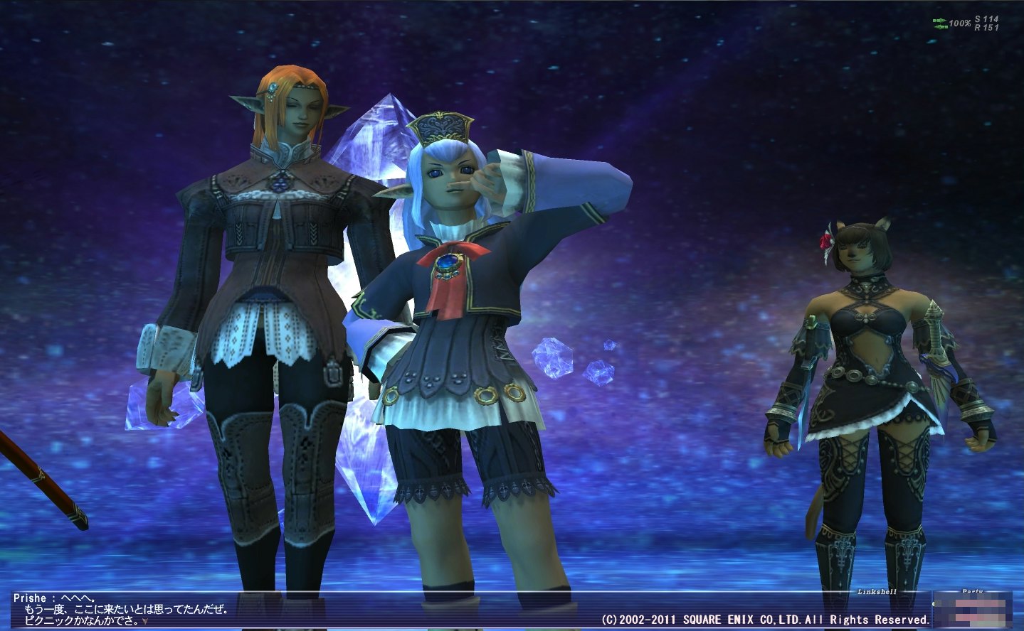 BCに入れるようになったので、早速挑戦してみました!ъ(`ー゜) SSが少しだけあるので、一応ネタバレにならないように折りたたんでおきます。 実装されて数年?いまさらネタバレ?という気もしないでもないですがw プリッシュがわたしの心境を代弁するかのような台詞があってビックリ。 ほんと、天象の鎖の中、ピクニックでいってみたい・・・。 甦ってきたエルドナーシュ&カムラナート。 戦うのはこの兄弟だけですが、イベントでは、 敵味方ともに今までのキャラが総出演します。 どうせなら、全部普通にBCで表現してほしかったな~。 敵NPC&味方NPC多数の、お祭り的な感じで! 戦闘中のSSは余裕がなかったのでありません! 戦術は、当初は姫が白/黒で印リポーズでカムラナートを寝かせて、 その間になんとかエルドナーシュを撃破~の予定だったんですが・・・。 白だとMP回復手段がないし、サポ学で机上演習するか~! なんてアホなことを考えてしまい、BCに入ってから いやいや!これじゃ印リポできないって!と気付く始末・・・。(;´∀`) 仕方がないので、メインが絡まれ釣りで2人のタゲをがっちり固定して、 姫でカバーする方向に。 ってことで、戦ってみた感想! どうも敵のレベル自体はかなり低い模様? 日輪のバハムートは、ずっと殴ってても、 ちょこちょことしか詠唱中断がなかったのに、 この2人は詠唱中に何発か殴れば、かなりの高確率で詠唱中断になります。 また、HPも低く、後衛タイプのエルドナーシュは、 ダンシングエッジ3~4発で落ちる程度しかありません。 攻撃の命中率も低く、蝉なしでもさほど被弾はありませんでした。 というか、二人同時に相手にするとどうしても、相手してない方のガ系で 蝉が剥がされるので、蝉が維持できないというのが正しいのですが。 と、ここまで書くと、あれ?すごく弱い?と思うと思いますが、 ここで問題になってくるのが、エルドナーシュのワープ。 レベルが上がって、通常攻撃は問題ないものの、ガIII系は痛いので、 エルドナーシュから倒そうとしてたんですが、 遠くにワープ>即ガ系でどうしても詠唱中断できないことがあるんですよね。 あまりワープしない時もあるので、多少運も絡むのかな? また、ワープで姫の真後ろに出てくることもあるので、 姫も範囲技結構もらっちゃったりして、 リカバリーが遅れて~なんてことに。 サイレガなんかもかなり鬱陶しいのですが、最悪なのが エルドナーシュが使う物理ダメ&バインド&テラーのヴォーテクス。 この技のテラー時間が長めなので、これを2垢両方食らうと詰みです。 エルドナーシュの魔法の使用サイクルはかなり短いので、 まず間違いなく、テラー中にガ系2発とか食らって落ちます。 とりあえず初挑戦ではわからないことが多かったので、 長期戦になると姫のMPとかヘイトがまずいかな~、と思って、 WSは封印してできる限りワルツで回復するようにして戦ってみたんですが、 残り2割ほどでヴォーテクスを共に食らってしまって死亡。 とにかくエルドナーシュを潰せばいける!というのがわかったので、 衰弱回復後に、今度はTPを全部WSにまわしてたら、 ダンシング撃った直後にサイレガに姫まきこまれ、 続けざまにカムラナートから運悪く被弾&ガ3系が止まらず即死。 3度目の正直とばかりに衰弱回復後に挑むも、 またしてもヴォーテクスではめ殺され・・・。 さすがに衰弱3回では残り時間が足りるとは思えなかったので、ここでいったん排出待ち。 そして、間をおかず2度目のBC突入! 結果は・・・ 余裕で勝利!!!! TP技は1~2回しか使われないので、ヴォーテクスが来なければ大安定。 運悪くヴォーテクスが来ても、後衛が食らってなければなんとかなるんじゃないかな。 勝った時は、ヴォーテクスが来ずに、石化技のオメガジャベリンでした。 これは単体だし石化はストナで治せるので、一番楽な技ですね! エルドナーシュを落とした後は、カムラナートとまったりとタイマン。 魔法は殴りで潰せるし、蝉張ってればほぼ被弾なし。 大風車がへヴィ&ヘイトリセ&ノックバックなので、 これを食らった後に姫にタゲがいっちゃって、 さらにへヴィでなかなか殴りに行けず~でちょっとヒヤッとしましたが、 1発殴るだけでタゲが戻って、そのまま撃破! 戦闘不能は1回もなしでした。 反省点。 姫がサポ黒なら楽勝だった!>< リポーズの効果中でどこまで削れるかというのがわからなかったので、 サポ学でもまぁいいかと思ってたんですが、 4分ちょいで終わったので、MPとか気にする必要なかった・・・。 印リポーズでカムラ眠らせてエルドナーシュと90秒間ガチなら、 おそらくその間に沈められるか、沈む直前までは持って行けたんじゃないかな~。 サイレガとか余計な状態異常も来ないわけだし、すごい楽だったはず! 後は、単純に火力勝負でもいいですね~。 わたしはシ踊しかないので、どうしようもないですが、 侍とかだと、一人でも瞬殺可能なはず! というわけで、日輪&世界クエともに、 2垢でもしっかり準