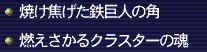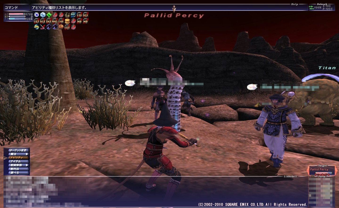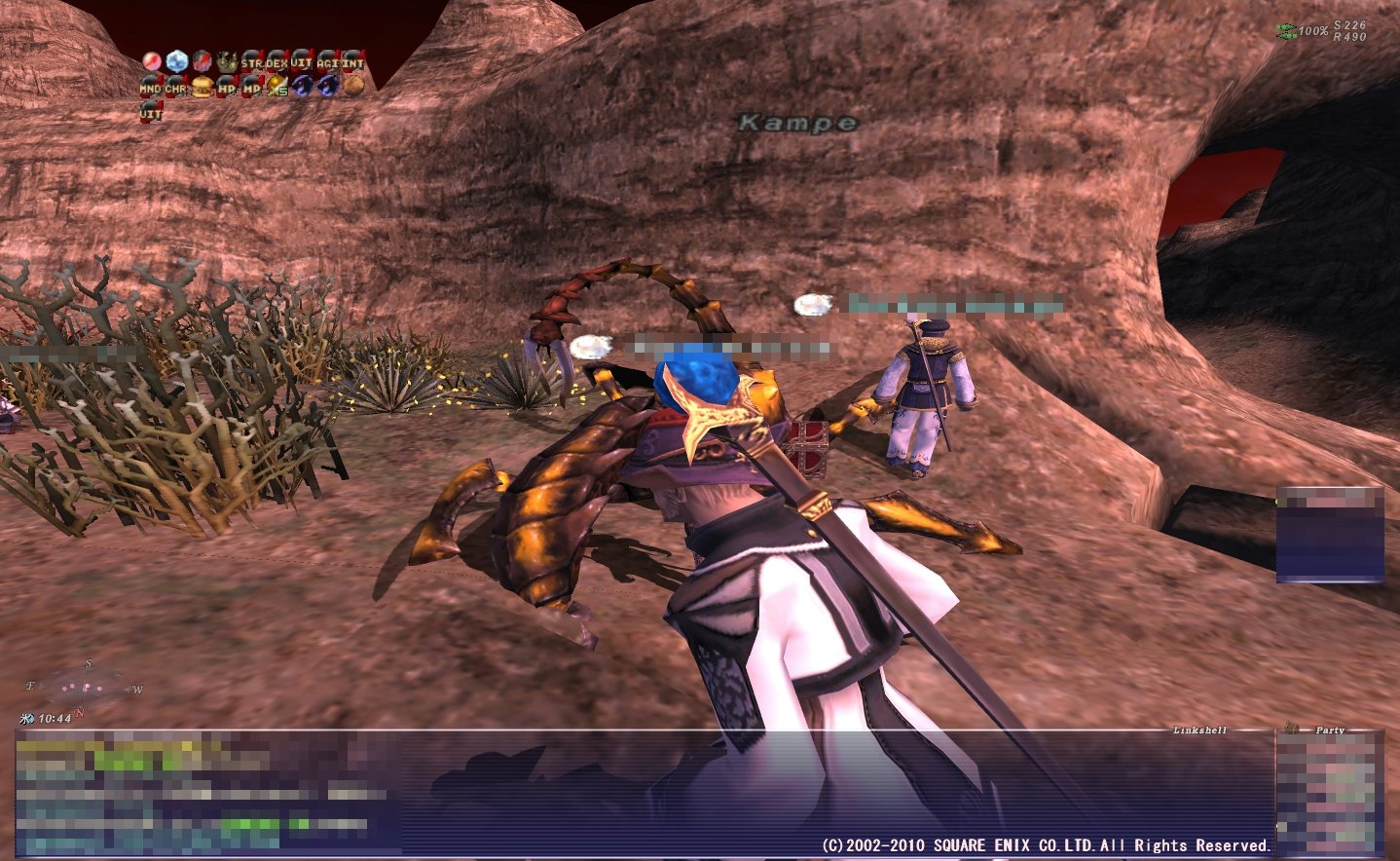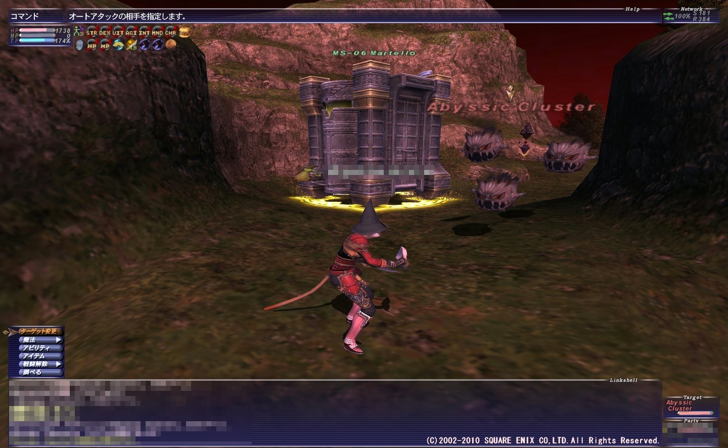 とにかくマッドストリームが強烈。 ダメージが大きい上に、魔法防御ダウンまでついているので、 タイミングが悪いとマッドストリーム>ガ系が続けてきて一瞬で全滅します。(;´∀`) 一度これをされて、ストンガで1800食らいました・・・。 引き寄せが来た瞬間にスタンさせればマッドストリームは止められますが、 タイミングはややシビア。少し遅れると間に合わない感じでした。 HPはさほど多くないし、マッドストリームの対処さえ出来てれば問題なしですね。 Kampe 周囲の雑魚が落とす不浄な鋭爪(R)を???にトレードで出現。 使用技は普通の雑魚サソリと変わらないので割愛。 注意点は、敵がTP技発動の構え~発動中に攻撃すると、 TP技連発モードになる事。 連発モードになったら、全員攻撃を止めてちょっと待てば、 すぐに連発モードは終わります。 この仕様のためか、TP技の威力自体は弱めに調整されている模様? 連発モードの対処さえわかっていればさほど強くありませんでした。 こちらはヒードリング狙いと、戦侍の型紙狙いでしたが、 何戦かやったもののヒードリングは出ず。(´Д⊂ 侍型紙は、前のミミズと合わせて8枚出て、1日で完成してましたw ついでにアートマもゲットしたり。 どっちも使いませんけどねw Abyssic Cluster
