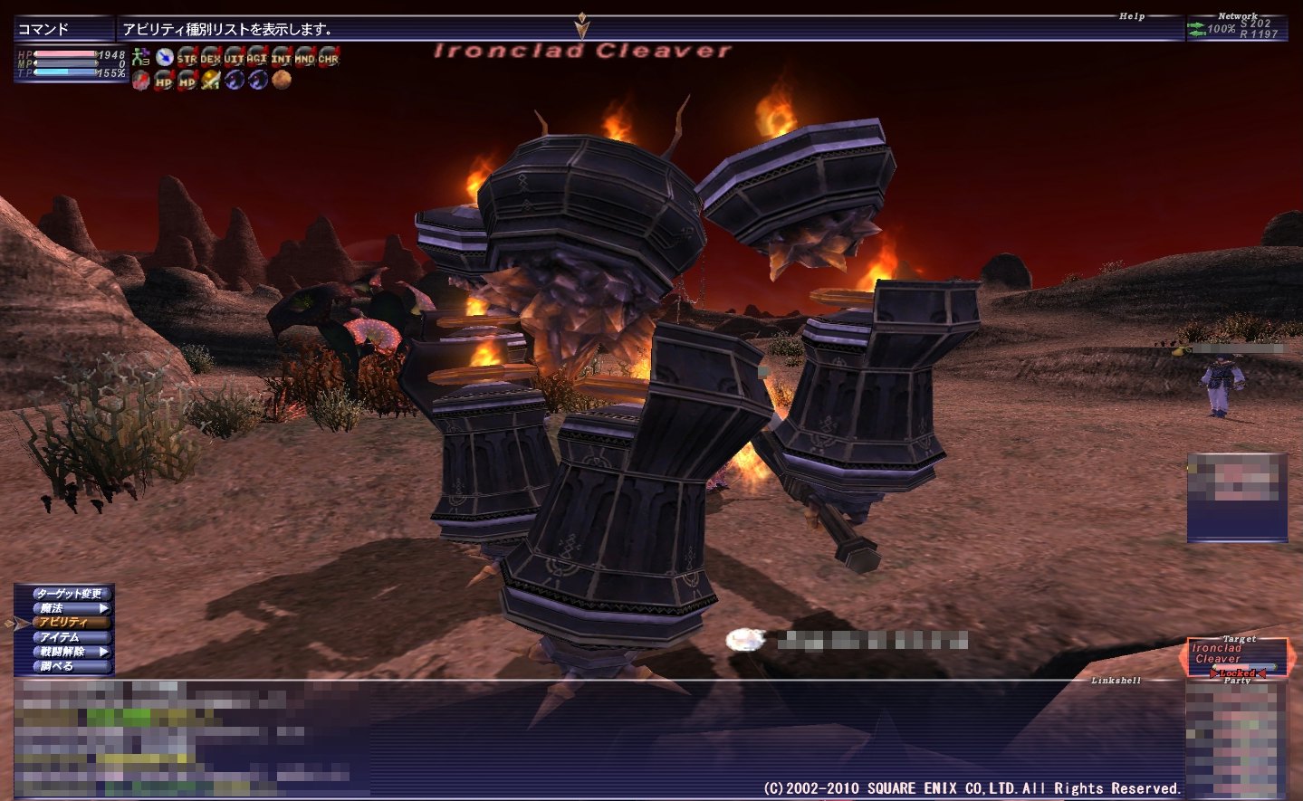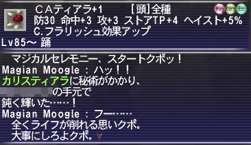 これにファイア5、ファイガ4と言う感じ・・・らしいです。 わたし自身はアウガースマッシュとファイガ4しか確認してません。 アウガースマッシュは基本3回攻撃?蝉3枚なら毎回被弾なしでした。 直撃だと結構痛いのかな?扇張ってたし、蝉ないときに直撃したことがないので 細かい点は不明です。>< 実際やってみた感じ、回避は問題なさそうでした。 回避50%とかいってた人は回避ブーストが足りてなかったのかも? 攻撃間隔がやや早め、DAありなので、蝉が回らないこともたまにありますが、 少なくとも通常攻撃だけに限って言えば十分何とかなるレベル。 が、やはり問題は蝉を大きく消費するTP技と、ファイガ4があるということ。 アウガーに関して言えば、扇と蝉枚数にもよりますが、あまりダメを受けないし、 モーションが長いので、構えが見えたら蝉壱をすぐに唱えれば、 ちょうどWSが終わったあたりで、 張り直し完了>ワルツでほぼ全快までいけるので問題なし。 問題はやはりファイガ4ですね~。 Vフラのスタンも一応入るのは入るんですが、スタッター5でも入らないことの方が多い感じ。 とめられないと蝉が全部剥がされた挙句1200とか食らうので、かなり厳しいです。(;´Д`) ワルツ4でも賄いきれませんからね~。 リキャの問題もあるし、3連打になるとTPの消費もきついし、 なんとか立て直すのにも相当の労力が必要です。 上で書いてるとおりファイア5もあるんなら、こっちが続けてきてくれれば楽なんですが・・・。 10回以上魔法となえられて全部ファイガだったしなぁ・・・。ホントにファイア5あるのかな? そんな感じでなんだかんだ頑張りましたが、最終的には こうなりました。(´;ω;`) 半分は削ったので、ファイガの頻度、Vフラの通り次第では勝ち目はあると思います。 次やるとすれば、魔命装備をきっちりVフラマクロに仕込んでスタン率アップ、 ファイガ4を走って避けられないかのチェック、なんかをしないとですね。 というか走って逃げられるかはさっさと試しておくんだった。(ノ∀`) 多少ファストキャストがあるっぽいので、 見てから避けるのは厳しそうに思えましたが・・・。 確か、ガ3系ぐらいの詠唱速度で撃ってきたような? 魔法撃ってくる周期は決まってるので、開けた場所まで引っ張って戦闘すれば、 魔法来そうになったら逃げる~詠唱止まったら戻る、の、 ヒット&アウェイはできるんでしょうけど、時間掛かるしめんどくさくなりますね!w 危ない時に後ろ向くぐらいはしますけど、 逃げながらはあんま好きじゃないし、できればガチで倒したいなぁ。 もう1個必要なだいじなものは、クラスターの時間POPNMなんですが、 こっちはソロいけそうなので、ちょこちょこいるかどうか見に行かないと! PR AF3狙いもかねて、久々にブンカで乱獲中心でやりましたが、