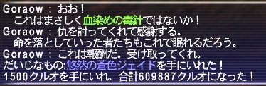 悪疫がちょっと鬱陶しいぐらい。毒もそこそこスリップ大きかったかな? WSのダメ自体は低いので、ヒーリングワルツで状態異常を治して、 HPそれなりに減った時はケアルワルツで全く問題ありませんでした。 回避は十分に足りていて、タイミング悪くデルタスラストでもこない限り、 蝉は常に維持可能でした。 回避装備さえしっかりしてればまず負けないかと思われます。 ということで あっさりと撃破! 血染めの毒針は2個ドロップすることもあるらしいので、 姫もミザレオ内で待機させてたんですが・・・。 残念ながら1個しか落とさず。 といっても、姫は石にだいぶ余裕があるし、 メインで取れただけでも御の字です!ъ(`ー゜) ちなみに、だいじなものも取れちゃってたり・・・。 このだいじなもの使って沸かすブガのHNMは踊盾もいけるっぽい!?ので、 一度やってみたいな~。 石1個で39分はありがたい! 最近もうこればっかりですけどw