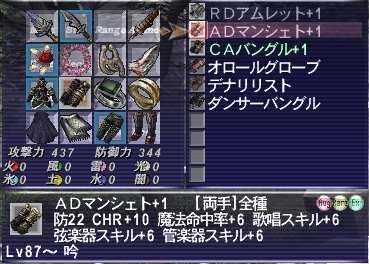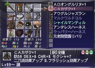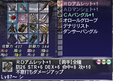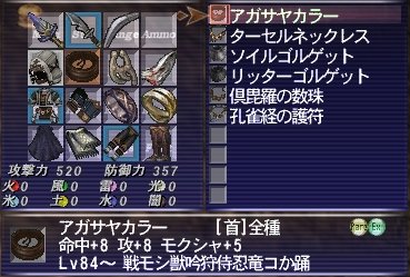 それとNMから装備を1つゲット! 型紙も基本NMから取ってるので全部NMがらみと言えばそうですが!w 型紙NMはすべて踊&黒の2垢でやりました。 シ手型紙はグロウベルグの魚NMから。 トリガー1つもともと持ってたのと、踊手の時に、 ウルガランの牛からはあまりシ手がでなかったので、 やったことないほうでやってみるか~、という感じで。 比較的トリガーのドロップもよく、シにかなり偏ってくれたので、 割とすぐに揃いました。 NM自体は、ジャ>ガ系のセットがかなり痛い以外は問題なく。 ジャをスタンで止めてもガ系が来る&後半のガ系が痛いので、 ジャを普通に食らって、ガ系をスタンで止めてやりました。 詩手型紙はグロウベルグの壺NMから。 こちらはトリガーのドロップが渋めで面倒でした・・・。 魔法の頻度が高く、精霊のガ系に偏ると、白がいないと回復が追い付かないかも。 スタンは普通に通るので(Vフラはスタッター入れててもレジがちらほらあり)、 精霊ガ系止めるとかなり楽になります。 後はバッテリーチャージ後に、しばらく強烈なショックスパイクがつくので、 後ろを向いてやり過ごしさえすれば問題なし! こちらは途中から召喚手目的のフレも誘ったので、すごい楽になりました。 これまたアエドに偏ってくれたしね! 詩足型紙はブンカのサルNMハヌマーンから。 まだ作ってなかったのか!と突っ込まれそうですがw CHRは他の部位で補えるし、魔命+のゴリのが良さそうかな?と後回しに。 移動速度アップはオンリーワンですが、詩人出すことも少なめでしたし。 最近は五行狙いとかだとむしろ詩人ばかりになってきたし、この機会に、という感じ。 ついでにアートマも取ってなかったので、こちらもゲット。 アガサヤカラーは、アットワの変色がドロップ。 倒すこと自体はソロでも楽勝なので、突時間にわかせて短剣弱点を祈るのみ! 門近くでわいていたときは、ワープでタゲ切りして弱点変えたりもしてました。 といっても、他の人に倒されまくりで、なかなか出会うことすらできず。 結局、3回目に青ついて倒した時にようやくドロップ! 13:59の突時間ギリギリにわかすことができて、シャドーステッチが弱点、 さらにドロップとか、ちょっと盛り上げすぎでしょう?と思ったりw これでシが首がアガサヤ、手がRDアムレット+1、他ヘイスト装備で バランスよく能力を上げつつ26%を維持できるようになりました! 詩人も手がずば抜けた性能だし、いい感じ。 足はちょっと迷いましたが、移動速度アップあるし、いちいち着替えるのも・・・ という感じでAF3を常用することにしました! そろそろソロとか2垢で取れる装備がなくなってきたかも。(;´∀`) ようやく胴型紙が揃いました!