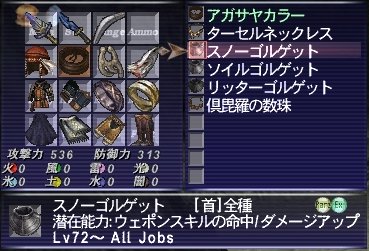 というのが多すぎる!\(^o^)/ というわけで戦闘中のSSとかはないですが、 なんだかんだで装備がいくつか増えました。 スノーベルトとトリプルスダガーは、AbウルガランのIsgebindから。 ウィルム族ですが、さほど強くはなかったです。 ドラグアよりは鬱陶しい・・・かな? ウィングが広範囲にダメ&麻痺、さらに麻痺フィールド展開で 前衛の動きが阻害されるのと、ホリッドロアのヘイトリセ、 後はブリザガIVがそれなりに痛いぐらいですね。 前衛2に白1だと、MPヒーラーいないときついかも。 とりあえず覇者NMのお約束というか、HP多いし硬めで時間がかかります・・・。 トリプルスダガーはD値もそれなりで振りも早いし、 TA強化もできるという、まさにサブ武器にベストな装備でいいですね! ダメージアップはほとんど誤差レベルらしい?ですが。 実際、使ってても実感できるほどではないです。 TA率も他の装備やら終焉やらでごっちゃだし、 ちゃんと検証しないと、はっきりわからないですね~。 スノーベルト、ついでにスノーゴルゲは、ルドラストーム用に。 器官取りなんてすっごい久々にやったなぁw ヨヴラ器官は強いほうのヨヴラを踊ソロで。 昔はこれ取るの、精霊PTでないと厳しかったものですが・・・。 今では、普通に殴ってるだけで強リジェネを上回って削れちゃいます。 レベル的にも格下になってますしね。 魅了はすぐ切れるし問題なし、ヴィオトリクバラージだっけ? 1000ダメ固定の技だけ注意が必要です。 アーン器官はドロップ悪いと聞いてたけど、 シ/踊でル・メト前でやって、30分ちょいぐらいで5つあっさりと。 トレハンが効いてたんでしょうかね? フワボは比較的ドロップいいし、結局2時間ちょいぐらいで全部そろったかな? ペミデ器官とユブヒ器官がないのはホント楽ですw 後は、姫の方でいくつか装備もちょこちょこと。 姫の方ではSSソフト使えないし、SSはないですけど! メインの方は欲しい装備がほとんど揃ってきてるので、 今後は姫の方の強化が中心になってくるかも? メイン、後はオセロットグローブとトゥワシュトラ強化ぐらいかなぁ。 フルバーも欲しいけど、使う場面がないような・・・。 イヴのトリガーはこの前2垢で乱獲して1セット揃ったので、 近いうちにLSメンに手伝ってもらってやりたいところです。('∇') 今度こそ出るといいな・・・。 PR ロキカフタン:胴