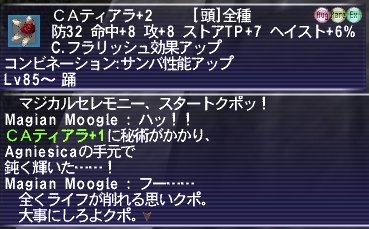 これで+2が2箇所となり、コンビネーションのサンバ性能アップが発動します。 サンバ性能アップといっても、時間が長くなるとか効果が上がるとかではなく、 サンバ中に時々倍撃が出る、という効果なんですけどね。 ってことで、発動率が気になるし、早速使ってみたんですが・・・。 さすがに2箇所だけだと発動率はかなり低いですね。(;´∀`) データ取ってるわけじゃなく、できる限りログ見て~での判断ですが、 20~30回とかにようやく1回出るかどうか、という感じだったと思います。 3%とかその辺くさいかな? 現状だと大して強くないですね・・・。 あと、なんかイオリアンエッジにも倍撃乗ったくさいログがあったので、 WSにも乗ると思ってよさそう? イオリアン素撃ちで400越えは初めてだし、フルとハーフレジではないはず・・・。 まぁ現状の発動率だとあんまり期待できませんけどね。 脚も作ってみたいけど、ミザレオの変色ゴラホ強そうだし面倒! PR この記事にコメントする