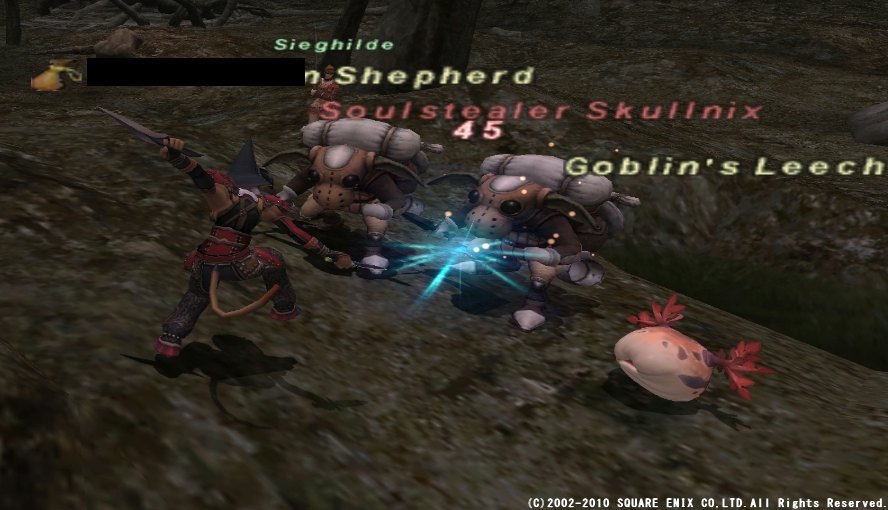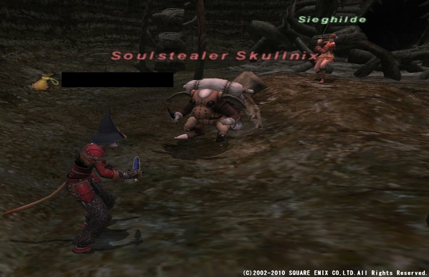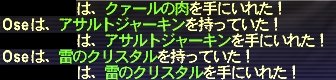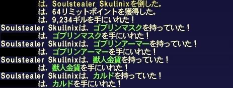 なんで急にオンゾゾなのかというと、踊り子が68になったので、 カルドがちょっと欲しくなってきたから。 70になったらベヒーモスナイフ+1があるし、 別になければないでいい装備ではあるんですが・・・。 NM狩るのは好きですしね。(´∇`) さらに、どうせだからOseとも遊ぼうかな~と思いながら突撃してきました。 さすがに取り合いするほどやる気があるわけではないので、 まずはカカッっとオンゾゾをサーチ。すると、ソロで忍とシの2人が。 どちらもソロが強いジョブだけに、NM狙いの可能性もあるな~と思いつつ、 NM狙いであるという確証は持てないので、とりあえず見に行くことに。 可能性としてはモルダバやコカ肉かな~とか思ってたんですが、 誰にも出会わないままオセ広場に到着。 あ~、これはNMかも・・・と思いつつ、まずは広場をチェックすると、 トラマは1匹も倒されておらず。 オセはとりあえず狙えそうってことで、続いてカルド広場に。 むむ、獣ゴブを残して狩られてる・・・。 ひょっとして、と思ってもっかいサーチすると、シで来てた人が消えてる! あ~、これはカルド狙いでNM倒された直後か~、とがっくり。 トラマはブラスターがウザイし、本命ついでに狙えないなら帰るかなぁ・・・と思ったものの、 せっかくきたんだし、とりあえず何回かは抽選倒すか~とトラマ狩り。 Oseとカルドゴブの抽選対象 白地図本舗さまより まずはカルドゴブ。上にもちらっと書いてますが・・・。 赤丸の地図では消えてる広場には、 ・ワイバーン or マンティコア ・戦士ゴブ or 獣ゴブ ・シゴブ or 白ゴブ この3匹の敵がいます。 orってのは、どちらがわくかランダムってことです。 抽選対象は、シ or 白のゴブ。簡単ですね。 続いてオセ。 広場を4つに区切って、数字を振ってありますが、 1と2には1匹、3と4には2匹のトラマがいます。 そして、この6匹とは別に、この4つのエリアのどこかに、 ランダムでわくトラマが1匹いて、こいつが抽選対象です。 なので、1と2なら2匹、3と4なら3匹いるエリアのトラマを倒せばOK。 リポップで違うエリアにわくのを確認できれば、完全に絞ることも可能ですよ~。 (移動して他のエリアとの境界あたりに行くやつもいるので、分かりづらい時もあります) どうせリポップ長いので、全部倒せばいいと言われればそれまでなんですけどねw シソロだとトラマ倒すの面倒ですし・・・。 ちなみに、オセはエリア1にしかわきません。 というわけで、数が多かったエリアのトラマを全部倒して、 待ち時間の間に一応カルドゴブをチェックしに上の広場へ。 すると Soulstealer Skullnix (;゚ Д゚) …!? (つд⊂)ゴシゴシ (;°ロ°) というわけでまさかのPOPw NM狙ってる場合は、諦めるにしてもリポップ確認してから、 雑魚がわいた時点で帰るのが普通だと思うんだけど・・・。 対象倒した後で急用でもできたのかな?まぁラッキーってことでw こっちはフェローなしでも倒せそうだったので、 完全にソロでやるか迷ったんですけど、死ぬのも馬鹿らしいかな~、ってことで、 フェローを出すチキンプレイに走りました。(ノ∀`) というわけで戦闘してたら・・・ まるで狙ったかのように雑魚ゴブが遠くから一直線に近寄ってきてリンク! それまで隅っこをずっと移動してたくせにどういうこと・・・?w 幸いNM倒す直前だったし、ガチ回避装備でやってたので、 特になんと言うこともなく、あっさりと全部処理。 というわけで肝心のドロップはこちら! ドロップ悪いはずなのに・・・あっさりと出た!(*´Д`*) さすがにもう1回は来る気しないな~と思ってたので助かりましたw というわけで一番のお目当てはゲット。 トラマ倒すの面倒だし、もう帰ろうかとか思いましたが、 せっかくフェロー出したことだし、経験値稼ぎがてら、しばらく続行することに。 そして抽選対象を倒すこと2回。 あっさりとわいた!ъ(`ー゜) 敵の命中がやや高めなのと、ブラスターの麻痺がやばいので、 シで薬品なしではフェロー付きでもちょっと怖いかな~と思ってたんですが、 最近になって本気で揃え始めたガチガチの回避装備の力もあって、 特に危ない場面もなく撃破。 最初フェローが全然サイレナとパラナ飛ばしてくれなくて、イライラしましたが! やまびこ薬は常備してるので、面倒になって1回使っちゃいましたw そしてドロップ。こっちのログは一部だけですが・・・。 (;゚ Д゚) …!? (つд⊂)ゴシゴシ (;°ロ°) ってことでまさかの連続ドロップ! 正直使うかどうかは微妙なんですけどねw 踊り子でWS用に使えるのは使えるけど、 基本は踊りにTP回すし、着替えてまでWS撃つことはあるのか・・・w なにはともあれ、そう時間をかけずにNM2匹やれた上に、 どっちもドロップしてくれて大満足! この他にも、踊り子MMMに誘われてがっつり稼げたし、 雷クトゥルブも60匹ぐらいやれたしで、なかなかに濃い1日でした!(*´Д`*)