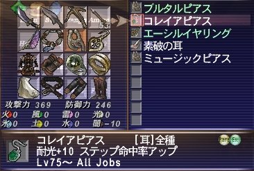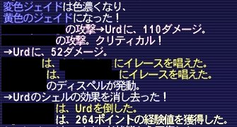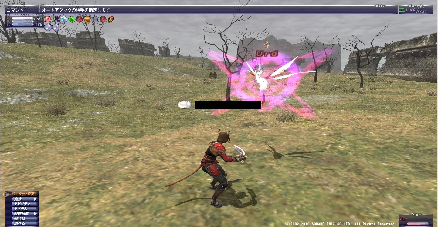 3匹やったものの変色せず。 コレイアピアスは1個ドロップして、踊り子やる気あるのが わたししかいないのでゲットしましたが・・・。 それより変色して欲しかった >< 構成はシ戦赤白黒詩。最後の1戦は詩人が抜けて5人で。 基本シ盾で、適度に戦士にタゲとってもらって不意WSでタゲ取り返し。 不意WS撃てない時に戦士に張り付いたらコラボ。 トランス(という名の明鏡止水もどき)が来たら、 タゲ取ってる人が離れることだけ意識してれば、弱いですね~。 少人数でやるならシ戦赤みたいに、シ赤+削り1名で勝てると思います。 踊が使えるなら、侍とのコンビで2人での勝利報告もありますよ! ただ、ウルドは楽なんですが、スクルドがわいてしまうと勝てないので、 その場合は、わかせた人がそのまま死んで、消す必要があります。 できればわかせた人が死ぬ前に、別の変色もちの人に座ってもらって、 ウルドがいる場所を特定しておいてもらうとベスト。 (ヒーリングは当然スクルドから離れた場所で。ヘイトリストにのっちゃいます) なので、できれば後衛は赤白とかいるといいかもしれません。 レイズ3ありがたや(*´Д`*) ちなみに回避装備はジュワタコと同じマクロでほぼ避けてました。 420あれば大丈夫だと思います。 一方攻撃のほうはというと、命中は410ぐらい必要らしいので、 スシがいいみたいですね。 3人いればほぼ勝てるのが分かったので、 ちょこちょこLSメンに頼んでやりたいな~。 というわけで通産5回目ぐらい?のジュワタコやってきましたよ!